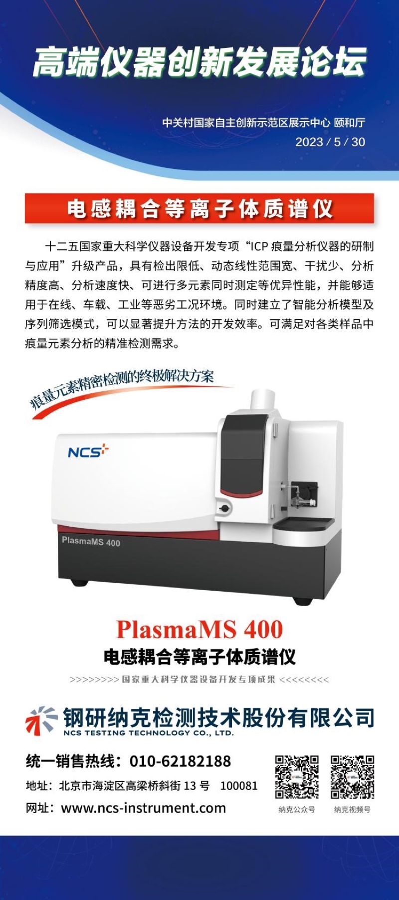 钢研纳克检测技术股份有限公司的王雷博士,带着公司新产品PlasmaMS 400电感耦合等离子体质谱亮相中关村论坛,展示我公司最新成果。钢研纳克最新推出的PlasmaMS 400型质谱仪采用了超高功率离子源、高效离子偏转、组合式接口等多项创新技术、同时结合智能推荐模型及序列测试功能,整机具备了高灵敏、高耐受及智能分析等特点,综合技术指标可全面对标进口产品。